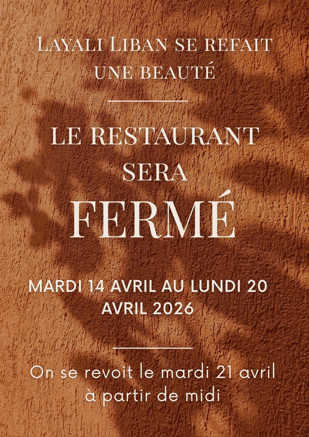 Le restaurant sera fermé du mardi 14 avril au lundi 20 avril 2026.